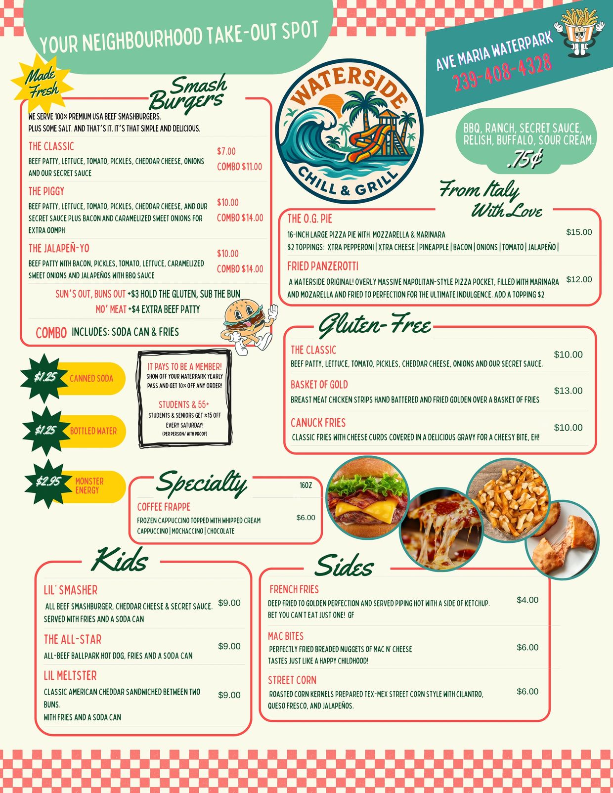 Waterside is Ave Maria’s Fave Take-Out Spot — where great flavor meets fast, friendly service! We’re proud to serve the community with American classics done right, always fresh and always satisfying. From our all-beef smashburgers sizzling hot off the grill, to our hand-crafted pizzas made with care, to our delicious iced cappuccinos that keep you fueled all day — every item is made to hit the spot. Whether you're grabbing lunch on the go, feeding the family, or treating yourself to your favorite comfort foods, we’re here to make take-out effortless and delicious.
